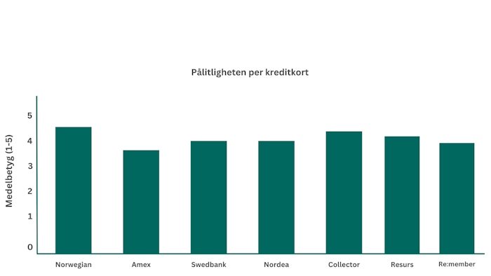 På frågan om kortutgivande bank anses vara pålitlig svarade de flesta ”stämmer mycket väl” alternativt ”Stämmer ganska väl”. I tabellen nedan visas pålitligheten utifrån en skala 1 – 5. Som visas har Norwegian och Collector högst betyg medan det enbart är Amex som har ett betyg under 4. Återigen bör begränsningen att kunna använda Amex överallt i samhället dragit ner kortets pålitlighet.