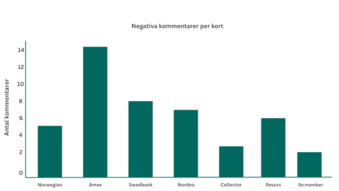 Amex är även den kortutgivare som fått allra mest negativa kommentarer i undersökningen. Med 15 negativa kommentarer får de nästan dubbelt så mycket kritik som Swedbank, vilket är den kortutgivare som fått näst mest kritik.