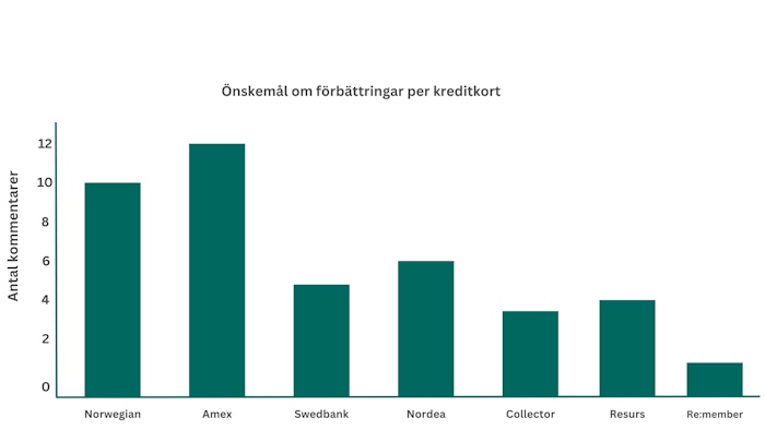 Det tredje som önskas är ”bredare användning”. I detta fall är det Amexkorten som återigen kritiseras utifrån att de inte kan användas överallt i Sverige. Det är även dessa kort som fått mest önskemål om förbättringar. Därefter kommer Norwegiankortet där bland annat förbättrat cashbackprogram önskas.
